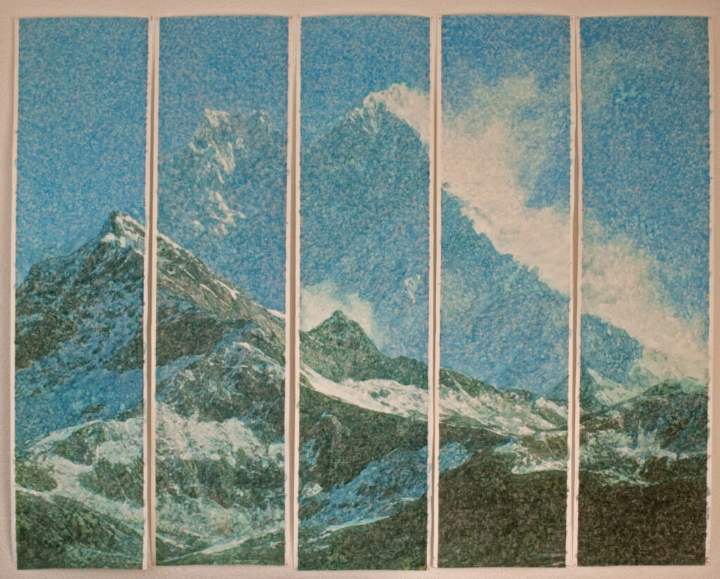 Ein früheres Kunstwerk zeigt ebenfalls den Text der Bibel, mit Gouache übermalen mit einem unbekannten Berg des Himalajas.
