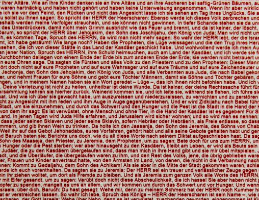 Die Gestaltung von umfasst ein zwei mal zwei Meter grosses Plakat, auf welchem der ganze Bibeltext abgedruckt ist. Das sind 726’510 Wörter in Schriftgrösse 4. Vor dem Text hängt an groben Seilen ein Kreuz aus altem Weidezaun-Stacheldraht. Dieses erinnert an den Kreuzestod Jesu Christi für alle Menschen und bildet den Fluchtpunkt des biblischen Wortes auf der Wand. Es lässt durch seine Form, seine Herkunft und seine Lage viele Interpretationen und Auseinandersetzungen mit Jesus Christus und der Bibel zu.